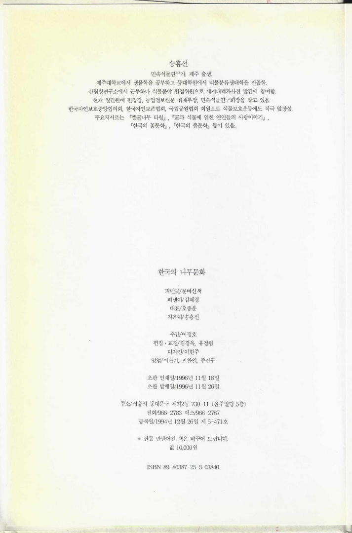 『한국의 나무문화』는 1996년 11월 26일 문예산책에서 출간했으며, 저자(글) 송홍선은 제주대학교에서 생물학을 공부하고, 식물분류생태학을 전공한 민속식물연구가이다.