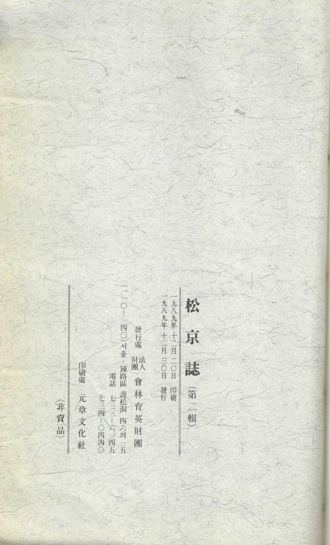2026년 1월 30일 「토리북스(북코아)」에서 만오천원에 구입한 『송경지_2(松京誌_貳)』는 1989년 12월 30일 회림육영재단이 발행하고, 원장문화사가 인쇄해 발간한 책으로 국한문 혼용의 세로쓰기로 번역하고 한문원본 축쇄영인본을 말미에 실어 두었으며, 겹장 오침안정법(五針眼訂法)으로 엮은 책이다.