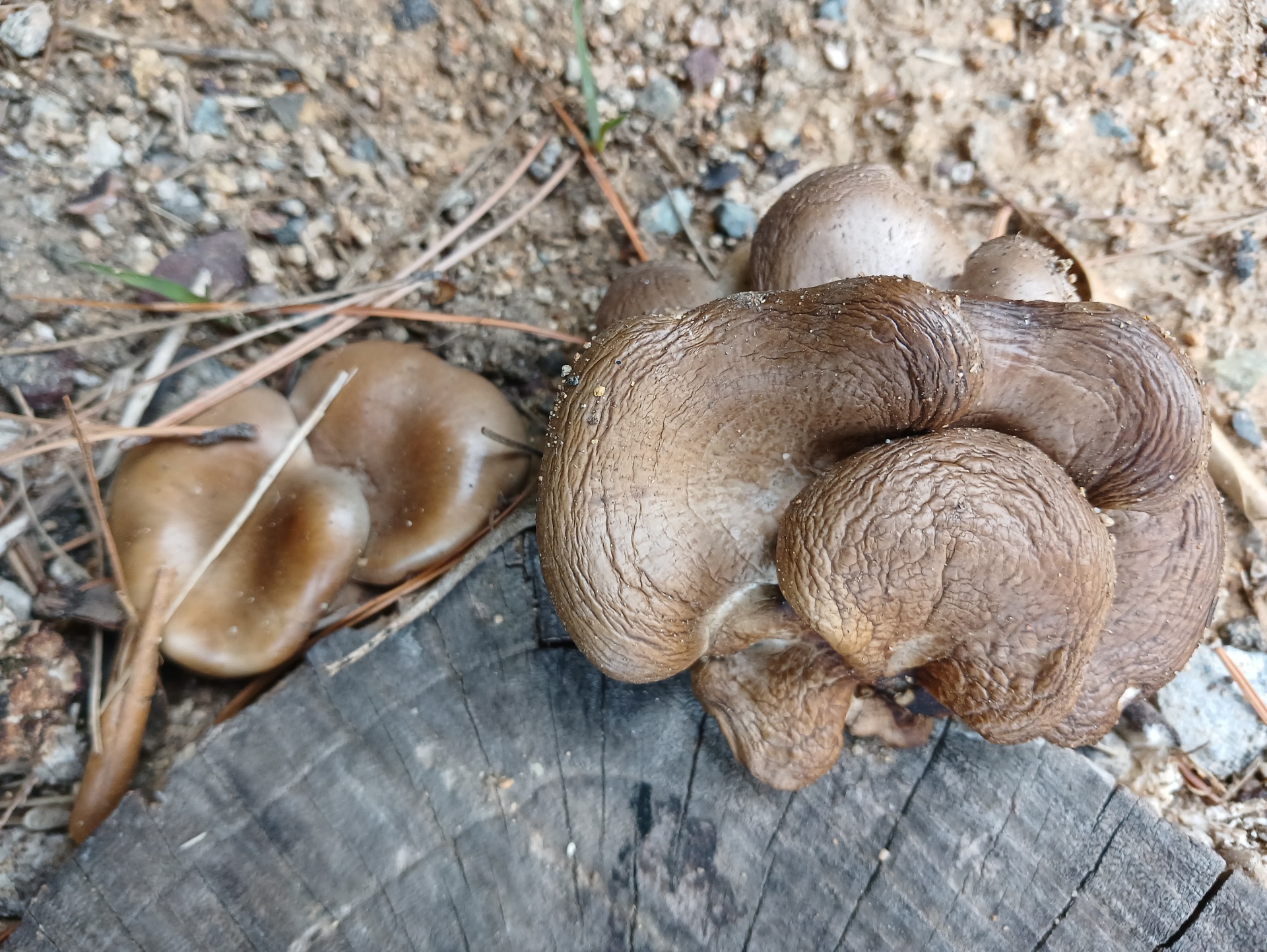 집 인근 완충녹지(緩衝綠地)의 죽은 나무그루터기에 느타리버섯이 발생했다. 발견 당시 큰 개체는 딱딱하게 굳은 상태였고 작은 개체는 약간 말랑했지만거의 굳어가는 형국이었다. 숙주가 되는 나무는 알지 못한다. 느타리버섯이라 생각했지만 확신할 수 없어 버섯전문 카페에 이름을 물어 확인했다. 담자균문(Basidiomycota), 주름버섯강(Agaricomycetes), 주름버섯목(Agaricales), 느타리과(Pleurotaceae), 느타리속(Pleurotus)의 느타리버섯은 학명이 Pleurotus ostreatus (Jacq.) P. Kummer이다.